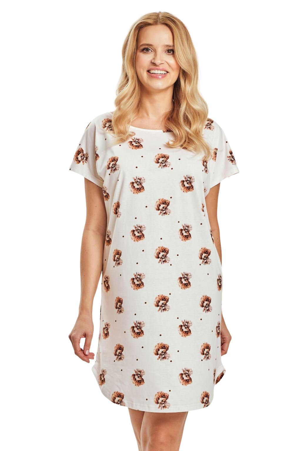 Pohodlná dámská noční košile s krátkým rukávem Taro. Dámská noční košile z kvalitní bavlny. Noční košile s krátkým rukávem, košilka má jemný potisk, délka nad kolena. Velmi příjemná bavlna. Košilka je vhodná i pro běžné nošení například jako domácí šaty.