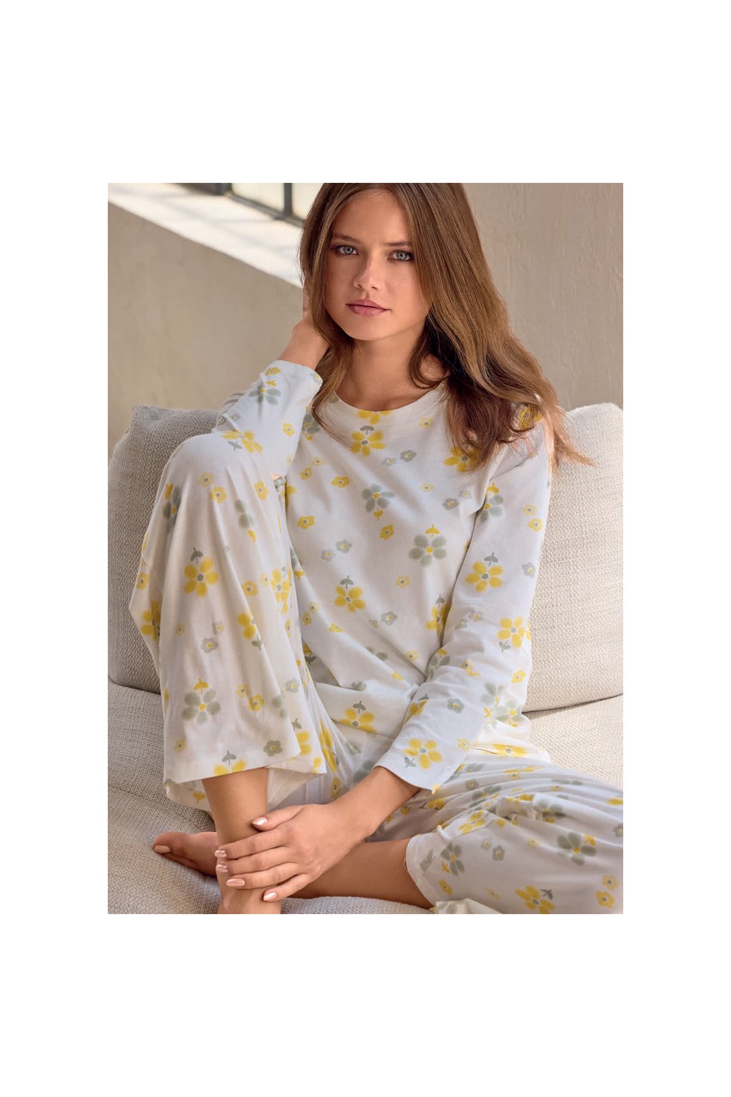 Dámské pyžamo značky Infiore v jemném krémovém odstínu s drobným květinovým potiskem působí lehce a velmi žensky. Horní díl s dlouhým rukávem má jednoduchý kulatý výstřih a pohodlný volnější střih který je ideální pro spánek i domácí relax. Kalhoty s rovnými nohavicemi krásně splývají a zajišťují maximální komfort při nošení. Příjemný měkký materiál je hebký na dotek a vhodný pro celoroční použití. Pohodlné a stylové pyžamo ideální pro ženy které dávají přednost jemnému designu a komfortu.